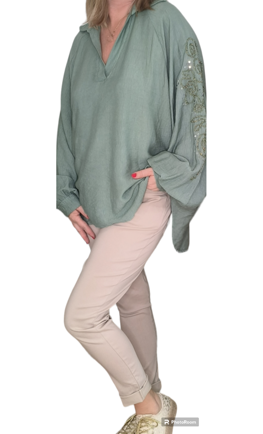 Blouse large coupe oversize broderie sur la manche avec paillettes.