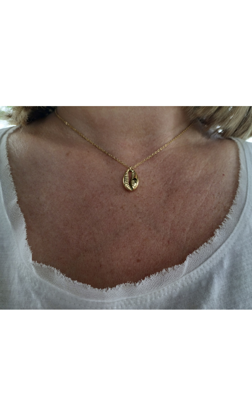 Collier réglable assez court avec cauris porte bonheur.