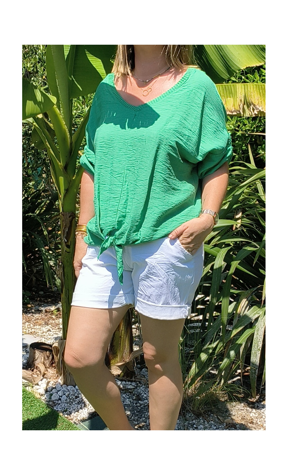 t-shirt style blouse avec manches courtes réhaussée d'un petit bouton noeud sur le devant et dos en finition macramé magnifique.