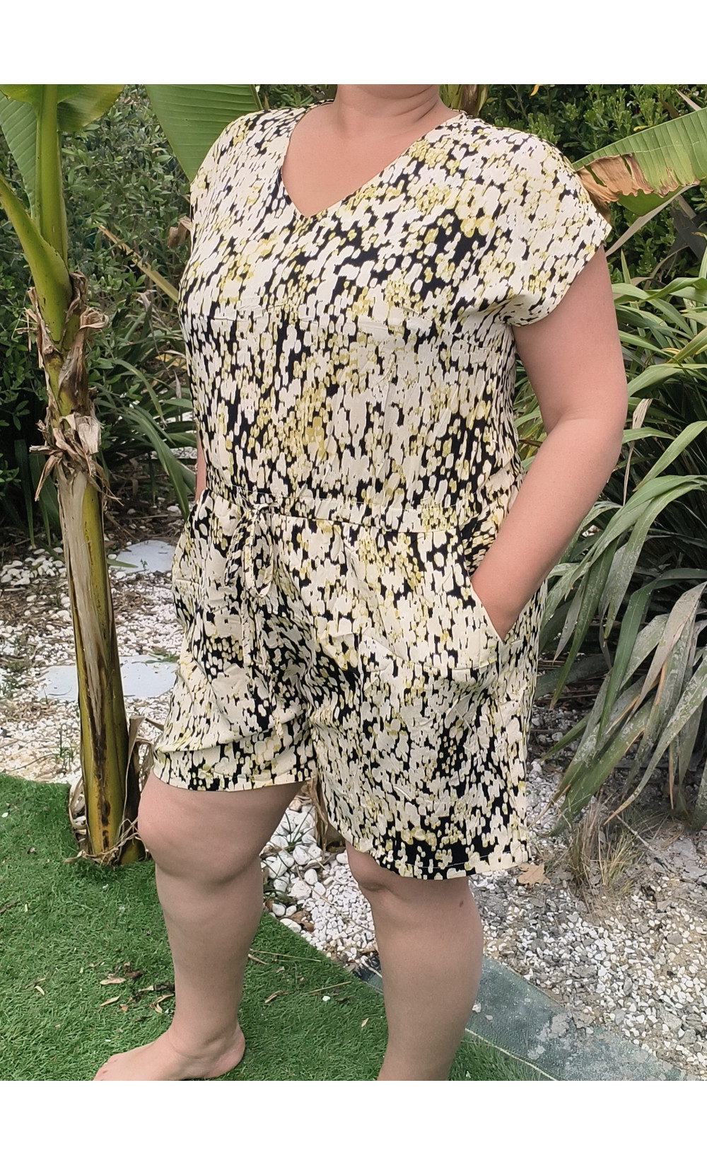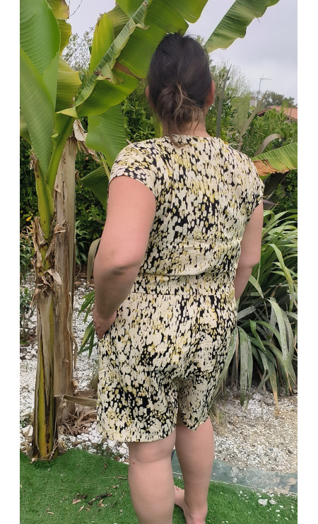 Combi short léger fluide fermeture éclair dans le dos resserrer à la taille par un élastique avec lien de serrage. Poche sur les côtés.