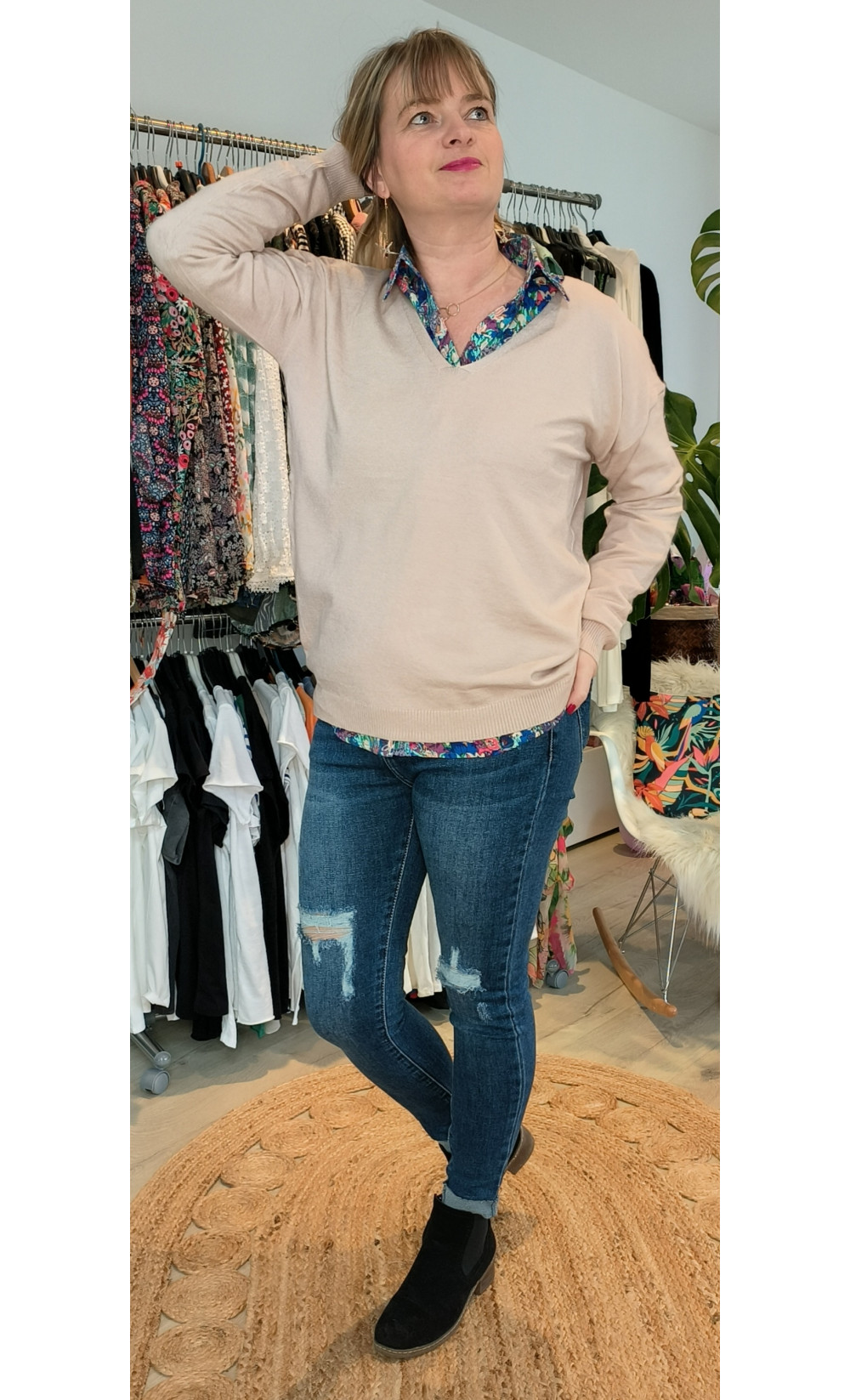 Pull fin mais chaud 30 % de laine. De couleur Beige.