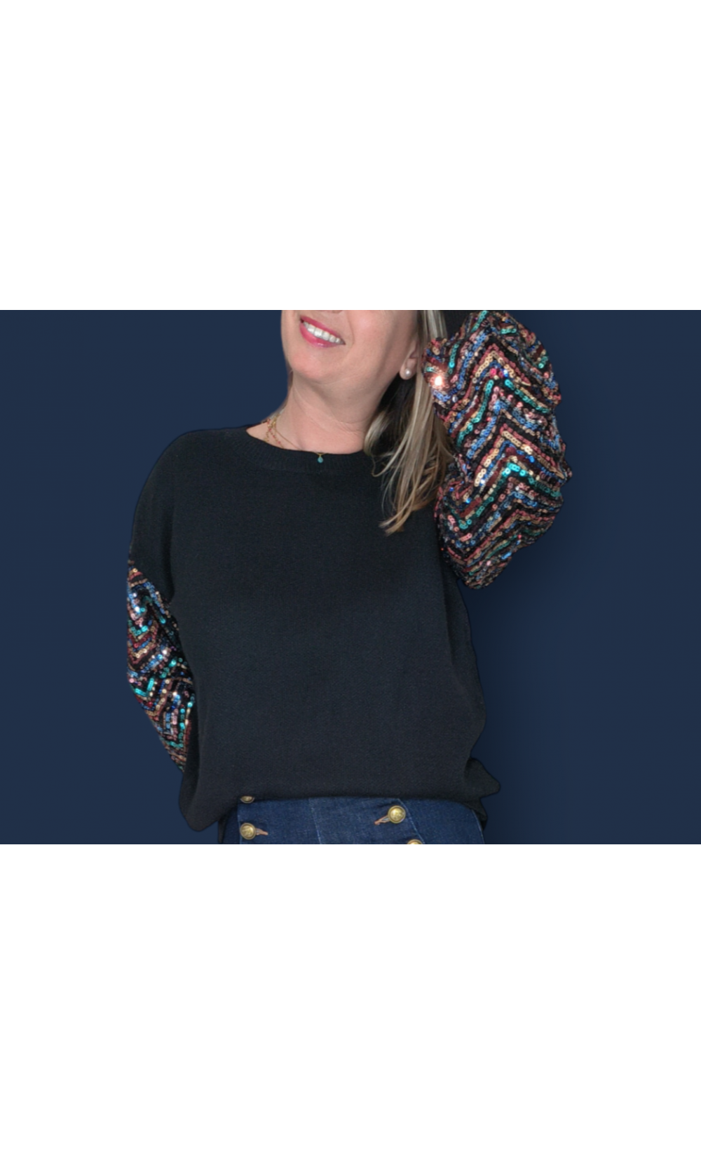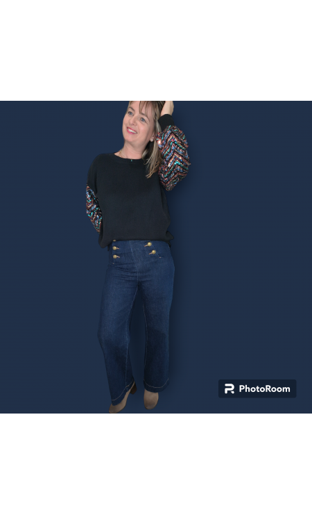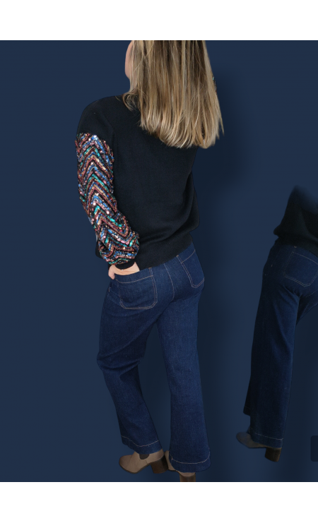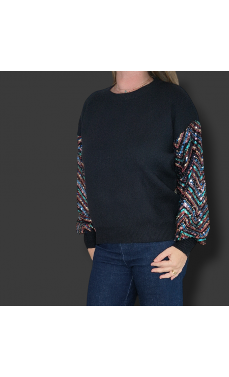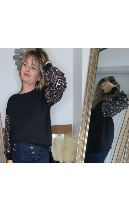 Pull fantaisie col rond manche paillettes multicolore.